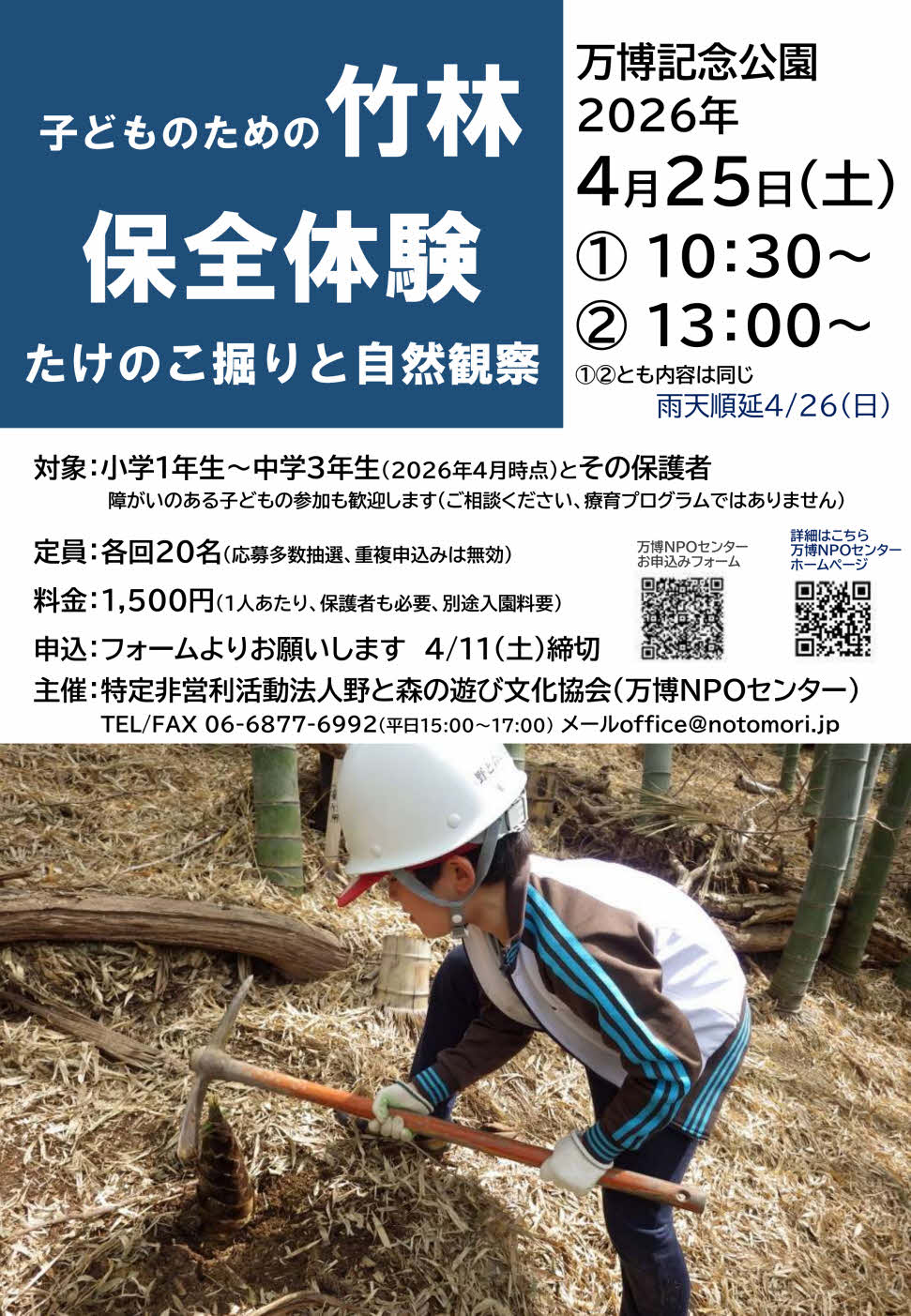 ・本イベントは環境教育プログラムとして実施しており、食べ頃の筍を掘るイベントとは異なります。あらかじめご了承ください。